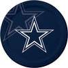 Show your team spirit with our Dallas Cowboys Dessert Plates. These officially licensed NFL plates feature a stylish silver border with a blue background and the image of the team helmet and bold "Cowboys" headline. Constructed from heavyweight paperboard, these 6.875" round plates are perfect for both indoor and outdoor events. Serve up your game day treats with pride and pair the cake plates with themed or solid color party supplies. With 8 plates per package and 12 packages per case, you'll have plenty of plates for all your Cowboy fans. Show your loyalty and bring home the win with our Dallas Cowboys Dessert Plates.