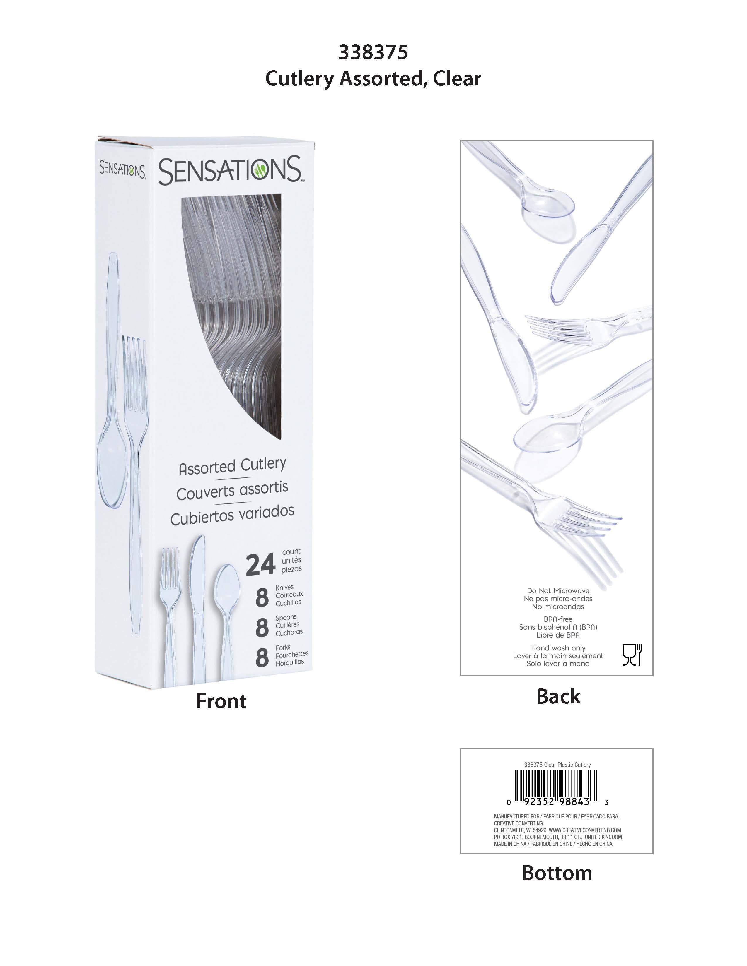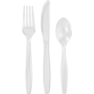 Brighten up any party table with our Clear Assorted Cutlery ! This pack of 288 pieces will give you 12 packages of 24 pieces, giving you plenty of plastic cutlery to serve your guests. Each package includes 24 pieces with 8 each of knives, forks, and spoons, with 12 packages per case. The clear color gives a modern, sophisticated look to your tablescape, while the assorted cutlery makes it easy to serve both appetizers and meals. These durable plastic pieces are great for both indoor and outdoor events. Make your event special with our Clear Assorted Cutlery - you won't be disappointed! 24 pieces per package (8 forks, 8 spoons and 8 knives) and each case has 12 packages.