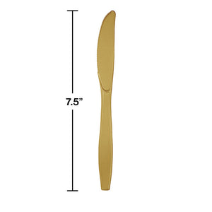 Create a memorable and sophisticated table setting with our Glittering Gold Plastic Knives. These heavy duty plastic knives come in packs of 24, with 12 packages per case, totaling 288 knives per case. At 7.5" each, they are the perfect size for any occasion. Whether you are hosting a large celebration, catering an event, or just need a cost-effective alternative for restaurant carryout orders, these golden plastic knives will add a special shimmer to your table setting. Paired with our other Glittering Gold bulk plastic cutlery, you can create a complete set of gold utensils that will elevate any event. Shop our Solid Color Party Tableware and Accessories to complete your glittering gold look.