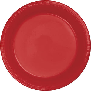 Introducing the Classic Red Plastic Dessert Plates, the perfect addition to any festive occasion. These plates are constructed with quality, recyclable plastic with a #6 recycling symbol and feature an elegant embossed pattern. The 6.75" diameter plates are strong enough to support heavier foods and desserts, and come in retail-ready packaging of 20 each, with 12 packages per case. That's a total of 240 plates per case! These plates are part of our Touch of Color brand in their selection of solid color party tableware and accessories. Add a touch of class to your next gathering with the Classic Red Plastic Dessert Plates .