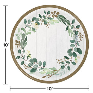 Make your wedding meal memorable with our Eucalyptus Banquet Plates. Sold in packs of 8 with 12 packages per case, these disposable plates come in a total of 96 per case. The plates measure 9.75" and are made of Heavyweight Paperboard for a sturdy feel. The plates feature a eucalyptus garland, green, white and gold theme, perfect for any eucalyptus themed event. With our discount pricing on bulk quantities, our Eucalyptus Banquet Plates are great for any party planner, catering service or home party planner. Make your wedding meal a special one with our Eucalyptus Banquet Plates.